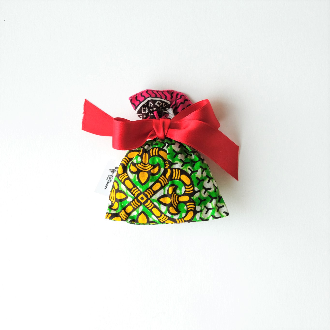 Misure: 15×11 cm Composizione: stoffa africana con chiusura in cordino. Ogni pezzo è unico e lavorato a mano e per gli ordini si richiede dunque un preavviso di almeno 15 giorni. Non è possibile scegliere le fantasie, che cambiano periodicamente in base alle stoffe disponibili. Salvo diverse indicazioni, le spedizioni saranno assortite.
