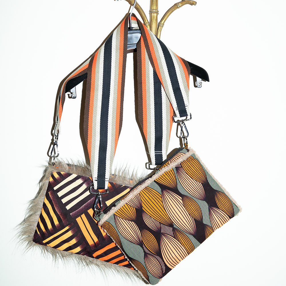 Borsa a tracolla in tessuto con fantasia multicolore. La struttura rettangolare è caratterizzata da bordi rifiniti in pelliccia ecologica, che aggiunge un tocco di morbidezza e originalità. La borsa è dotata di una tracolla larga e regolabile, in tessuto intrecciato con motivo a righe verticali nei toni del nero, arancio, bianco e grigio. La chiusura è a zip, la fodera interna in tessuto.