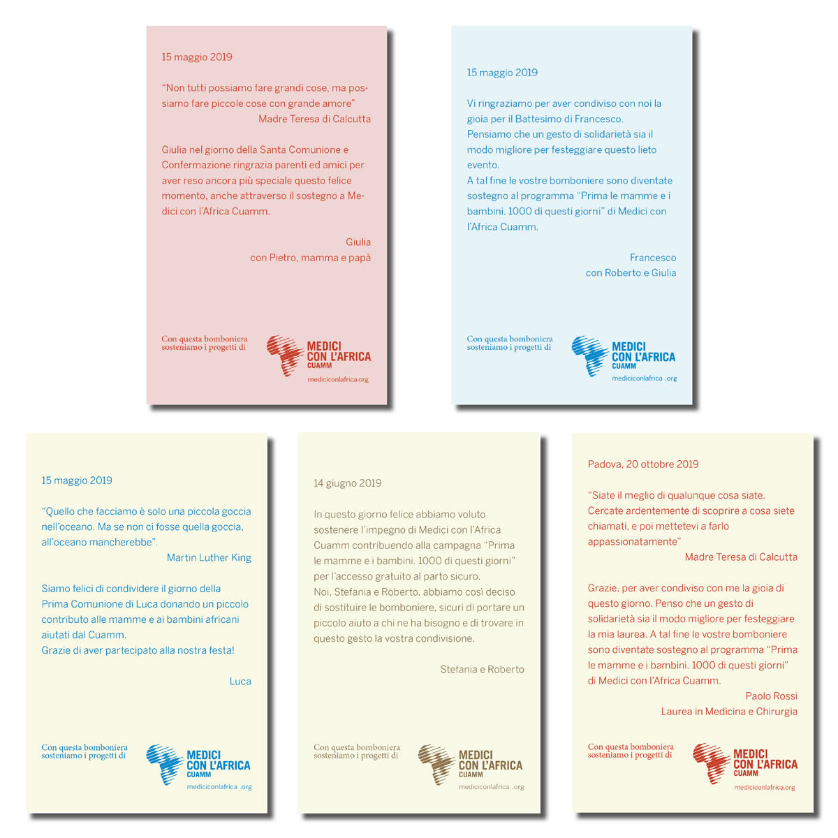 Per ogni eventuale richiesta, ulteriori personalizzazioni del biglietto e la proposta di altri gadget come bomboniere puoi scrivere una mail all’indirizzo bombonieresolidali@cuamm.org oppure telefonare al numero 0498751279 (referenti: Serena).